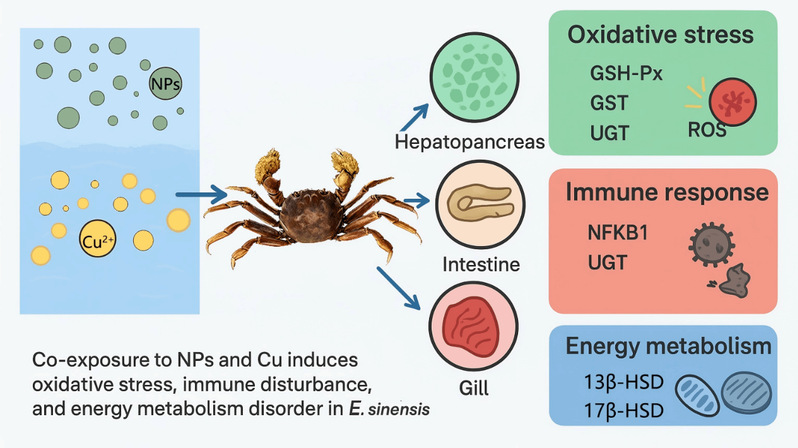 近年来,纳米塑料与Cu2+复合污染已成为全球水环境领域关注的热点问题,其在水生生态系统中的潜在生态风险不容忽视。中华绒螯蟹(Eriocheir sinensis)作为长江流域典型的蟹类经济物种,对环境污染因子敏感,是评估复合污染生态效应的重要生物之一。研究结果表明,中华绒螯蟹肝胰腺中纳米塑料与Cu2+的蓄积呈时间依赖性。中华绒螯蟹通过激活抗氧化与免疫相关基因及酶活性,增强免疫防御能力。纳米塑料与Cu2+联合暴露下,肠道和鳃组织表现出更高的敏感性与损伤程度。而纳米塑料与Cu2+单一暴露下,肝胰腺组织承受的胁迫压力更大。总体而言,中华绒螯蟹通过调控抗氧化通路、能量代谢通路和免疫通路及相关基因,应对纳米塑料与Cu²⁺的复合胁迫,维持机体稳态。