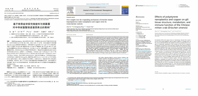 近期,中国水产科学研究院东海水产研究所在纳米塑料与铜胁迫对中华绒螯蟹影响的分子机制研究方面取得新进展。相关研究成果以论文《基于转录组学探究微塑料与铜暴露对中华绒螯蟹肠道基因表达的影响》《Effects of polystyrene nanoplastics and copper on gill tissue structure, metabolism, and immune function of the Chinese mitten crab (Eriocheir sinensis)》和《New insights into the responding mechanism of Eriocheir sinensis hepatopancreas under nanoplastics and copper stress by transcriptome analysis》,分别发表在中文核心期刊《渔业科学进展》、SCI期刊《Journal of Environmental Management》(JCR一区,IF 8.4)和《Frontiers in Marine Science》(JCR一区,IF 2.8)。东海水产研究所和安徽师范大学联合培养硕士研究生徐建为第一作者,冯广朋研究员为通讯作者。