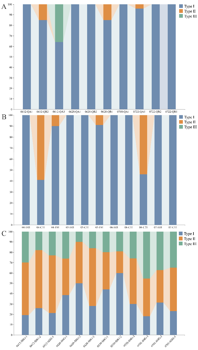 图1 秦皇岛海域褐潮发生年份(A和B)和非褐潮发生年份(C)抑食金球藻遗传结构组成变化