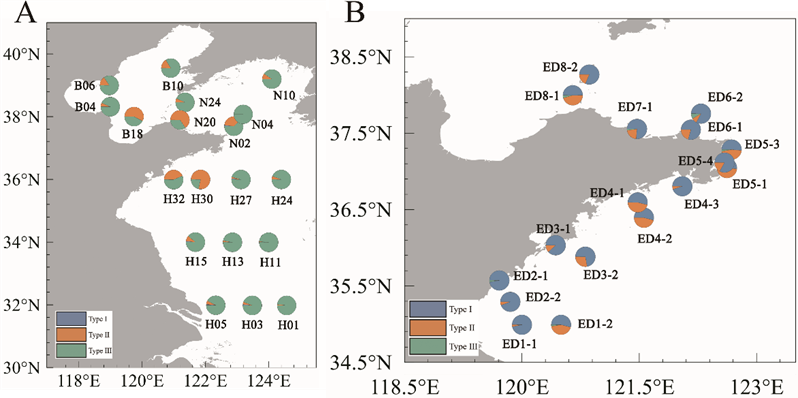 图2 渤、黄海(A)和山东半岛海域(B)抑食金球藻遗传结构组成