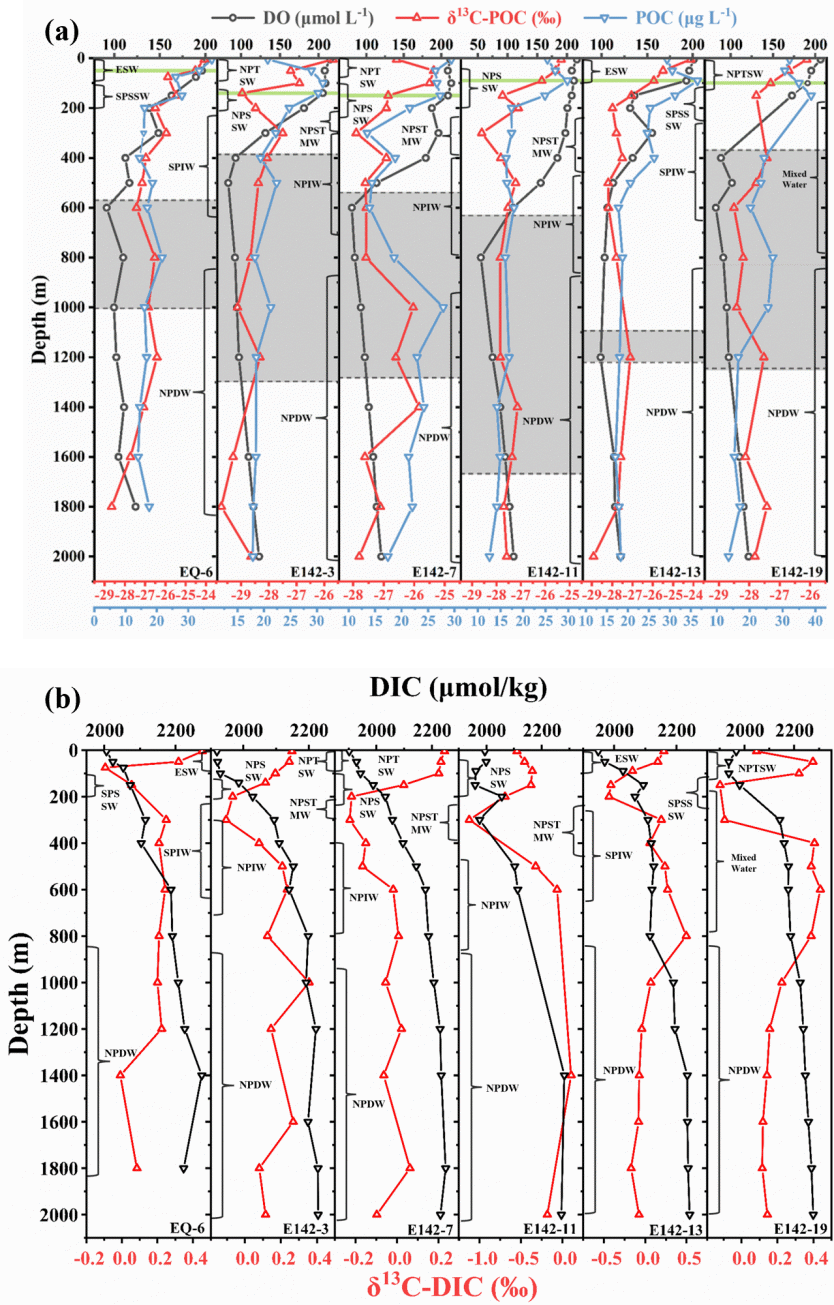图2 热带西北太平洋地区(a)POC与δ13C-POC、(b)DIC与δ13C-DIC的垂直分布特征