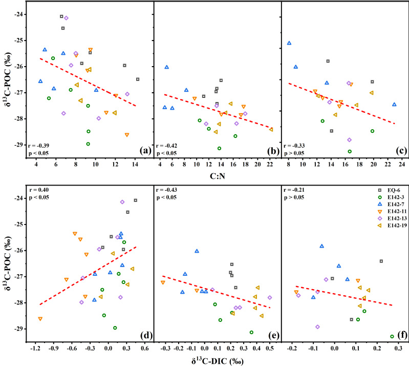 图3 各层δ13C-POC与C:N及δ13C-DIC的关系
