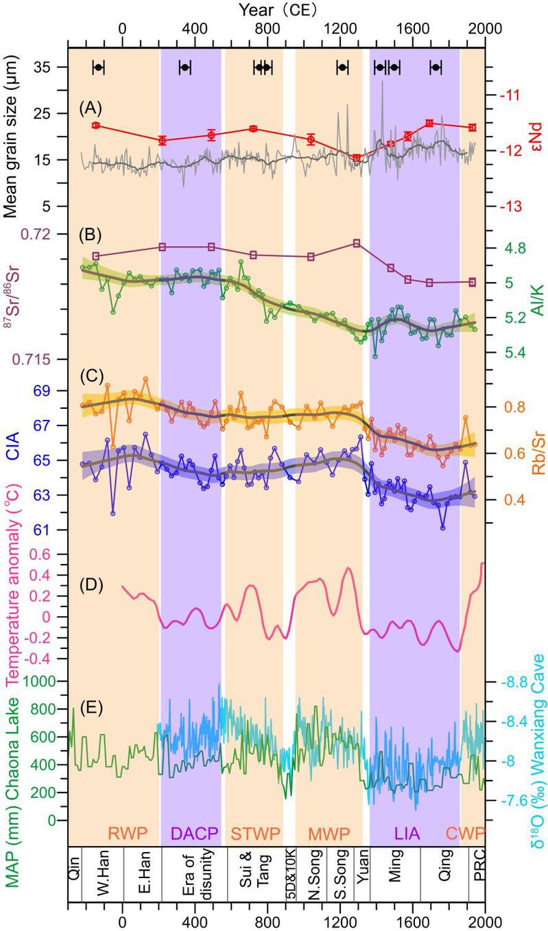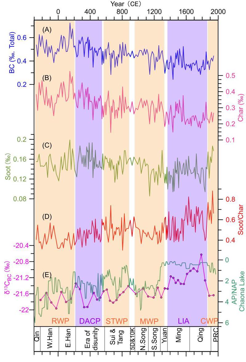 研究团队以南黄海山东泥楔的沉积物岩芯为研究材料,通过AMS 14C定年、粘土矿物、常微量元素和Sr-Nd同位素、黑碳含量及碳同位素分析,重建了过去2200年以来黄河流域的高分辨率化学风化和火活动演化历史。结果显示,化学风化强度总体受控于气候,但钾元素的淋滤自公元580年(隋朝)以来与气候变化解耦而呈现持续上升趋势,并在寒冷的明清时期达到顶峰。这暗示流域农业活动对化学风化的扰动,如农作物通过收获或秸秆焚烧等方式移除了土壤中大量钾元素,迫使含钾矿物加速风化。此外,黑碳揭示过去2200年黄河流域的火强度呈现长期减弱趋势,源于森林砍伐导致的流域植被减少。特别是,研究人员发现自公元1350年(明朝)前后,火的燃烧类型和植被组成类型均发生了显著变化。烟炱/焦炭比值指示的火类型在1350年从以气候主导的低温焖烧,转向更多人为引发的高温明烧。与此同时,黑碳的碳同位素组成呈现明显正偏趋势,指示燃料来源从C3天然木材转变为高粱、玉米等C4作物秸秆。这一转变反映了随着明清人口急剧增长,人类为应对粮食和燃料危机而进行的种植和能源革新。铅含量记录也显示,过去2200年来重金属输入持续加剧,尤其是在1350年之后更为显著。这一趋势与历史上明清以来冶金活动、金属工具制造等工业技术的发展密切相关。