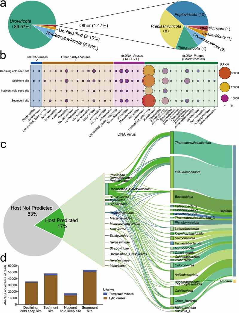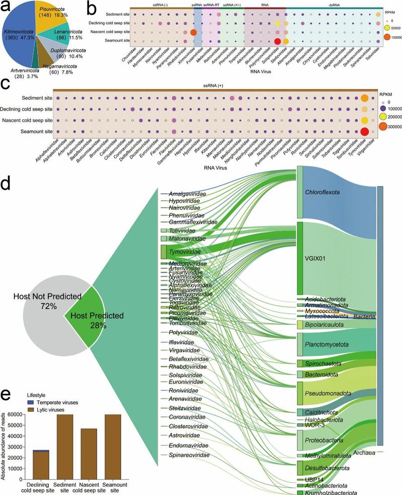 研究团队选择了四个样品采集点,包括正在衰减的冷泉、远离正在衰减冷泉的地点、新生冷泉和海山。获取上述四个采集点的沉积物后,综合利用宏基因组学、DNA和RNA宏病毒组学、宏转录组学等多组学技术,结合纯化病毒群落的表征,对不同深海沉积物的病毒群落和功能进行了深入研究。深海沉积物的病毒提取和宏病毒组学分析显示,深海沉积物中存在着多种多样的病毒形态(图1),包括大量DNA和RNA病毒,且有很大一部分是先前未被描述的病毒谱系。深海RNA病毒群落与DNA病毒群落相比,在宿主偏好和生活方式上表现出显著差异,尤其在新生冷泉中,RNA病毒的相对稀少和缺乏温和性噬菌体预示着不同的能量流动模式(图2)。虽然Tymoviridae等RNA病毒在深海沉积物中普遍存在,但新生冷泉特有的Xinmoviridae(感染真核生物)的富集,提示深海病毒多样性研究仍需进一步探索其真核宿主的作用(图3)。病毒基因组和宏转录组的分析表明,病毒中的功能基因在原位环境中处于较高表达水平,这也是其增强宿主代谢复杂有机物能力的有力证据。研究成果强调了不同冷泉和海山中病毒群落的多样性、生态作用和宿主相互作用,表明病毒在深海碳循环和微生物群落结构中的重要性。