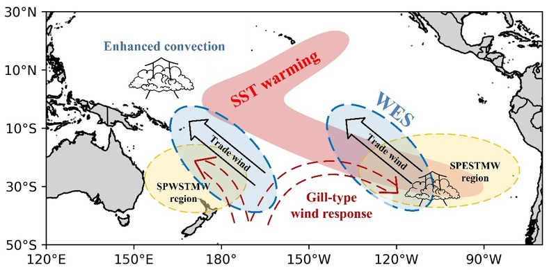模态水是位于海洋表面混合层下方、具有垂向性质均一特征的宏观水团,其潜沉与输运过程在海洋热量、二氧化碳及营养物质收支与再分配中具有关键调控作用,是连接海洋表层强迫与海洋内部响应的重要动力环节。作为太平洋副热带经向环流的重要组成部分,南太平洋东西部副热带模态水在潜沉过程中能够将热量、淡水和营养盐有效输送入海洋内部,对热带和副热带上层海洋结构及全球气候产生深远影响。然而,由于早期资料的时空分辨率有限,关于其潜沉率的时空变化及主控机制仍缺乏系统研究。因此,深入探究南太平洋东西部副热带模态水的潜沉变化规律及其受控因素,对理解海气相互作用及气候变化具有重要意义。