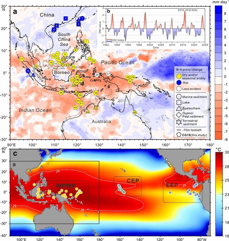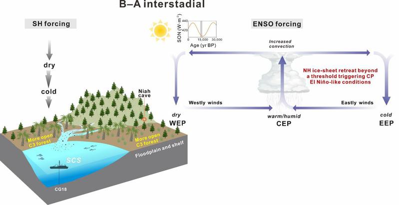 研究进一步揭示,Bølling–Allerød暖期西太平洋的干旱由ENSO与南半球强迫共同驱动。末次冰消期热带大气受轨道辐射冷却影响,首先在赤道西太平洋激发西风异常;随着北半球冰盖消融越过关键阈值,触发类中太平洋型厄尔尼诺状态,导致沃克环流上升支东移,进一步强化西风异常并形成正反馈。与此同时,南半球强迫加剧西太平洋的区域冷却与下沉气流,抑制深对流从而促进干旱;此大气调整亦使热带辐合带持续北缩,导致中国南方及台湾地区降水梯度显著增强。