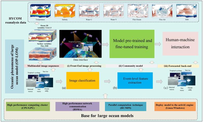 OP-LOM包括前端图像处理模块、通用特征提取共享模型和预报后端模块。上部为OSV背景场与用户交互界面,下部为模型运行所需的基础设施环境,包括GPU集群、网络通信、并行计算及部署支持。(a)多源多模态图像序列处理;(b)处理后数据的通用特征提取;(c)海洋现象预测序列生成。